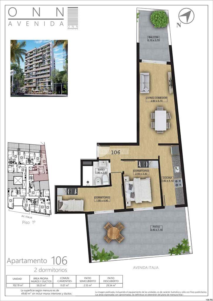 - INMOBILIARIA MONYMAR -AVENIDA ITALIA Y LUIS ALBERTO DE HERRERA... EDIFICIO ONN AVENIDA... ZONA DE EXCELENTE CONECTIVIDAD A PASOS DE AVENIDA LUIS ALBERTO DE HERRERA, PRÓXIMO A DISCO DE AVENIDA ITALIA, SODIMAC Y PLAZA ITALIA SHOPPING... A ESTRENAR ABRIL 2027... AL CONTRAFRENTE... Living Comedor con salida a PATIO. Cocina definida con muebles aéreos y bajo mesada, salida a PATIO. 2 DORMITORIOS con placares y salida a GRAN PATIO de 29m2 aproximadamente. 1 BAÑO completo. Previsión para Aire Acondicionado. Cortinas de enrollar de aluminio en estares y dormitorios. El edificio cuenta con SALÓN DE USOS MÚLTIPLES Y BARBACOA CON PARRILLERO, GIMNASIO, BICIPARKING, PISCINA Y SOLÁRIUM. GARAJES OPCIONALES.