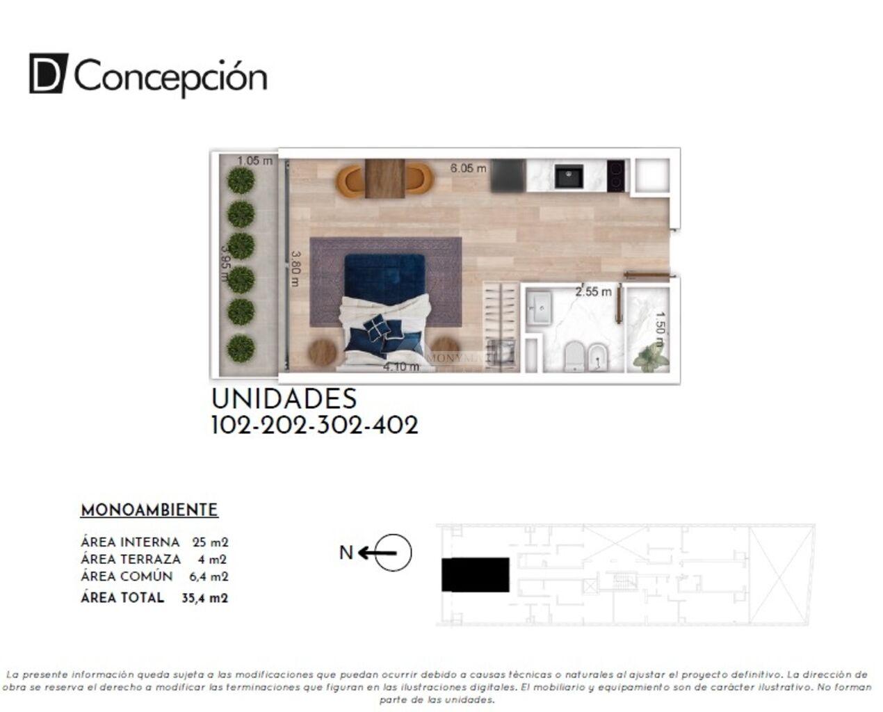 25m2 área propia + 4m2 terraza + 6,4m2 área común = 35,4m2 Total.
