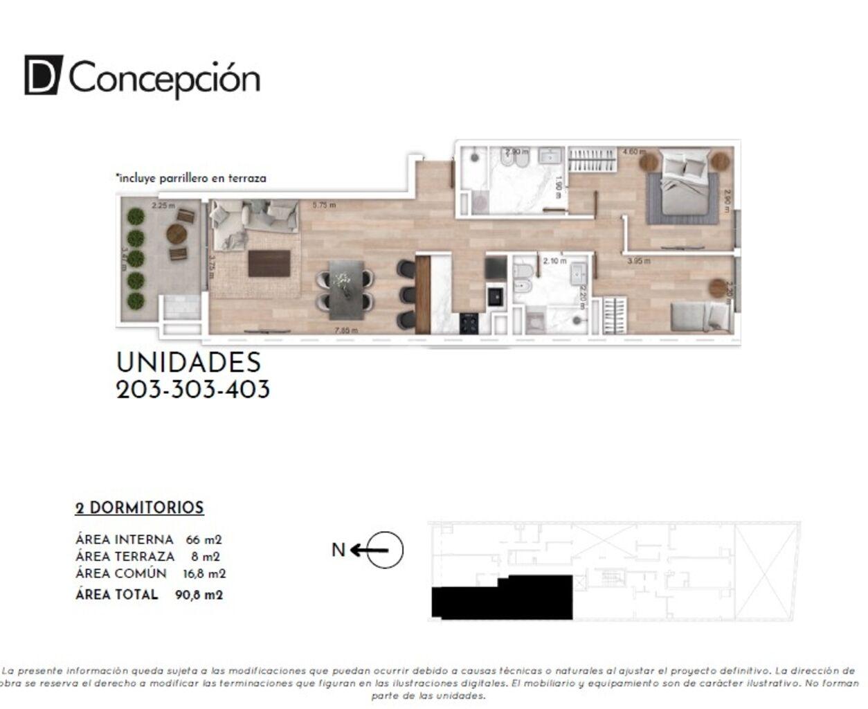 66m2 área propia + 8m2 terraza + 16,8m2 área común = 90,8m2 Total.