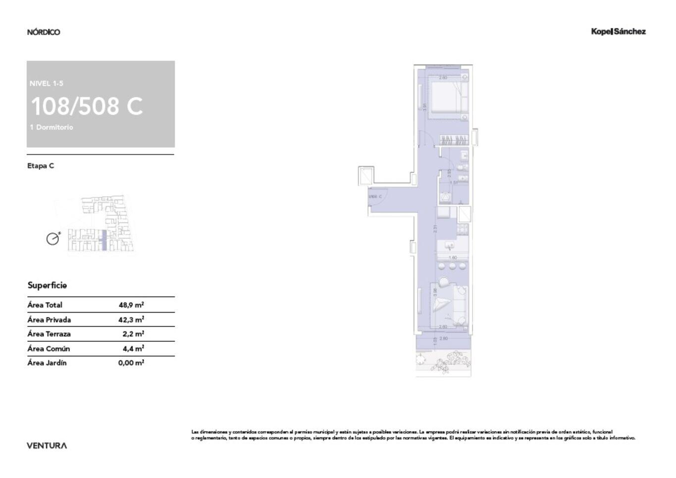 108 a 508) 42,3m área propia + 2,2m terraza + 4,4m área común = Total 48,9m.