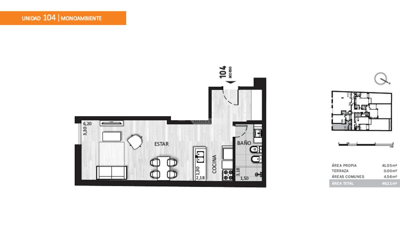 41,55m2 área propia c/muros + 4,56m2 área común = 46,11m2 totales.