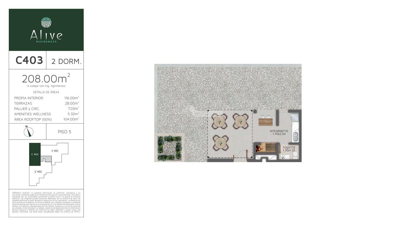 METRAJE: 116m área propia + 28m terrazas + 12,35m área común + 52m área rooftop= 208m totales